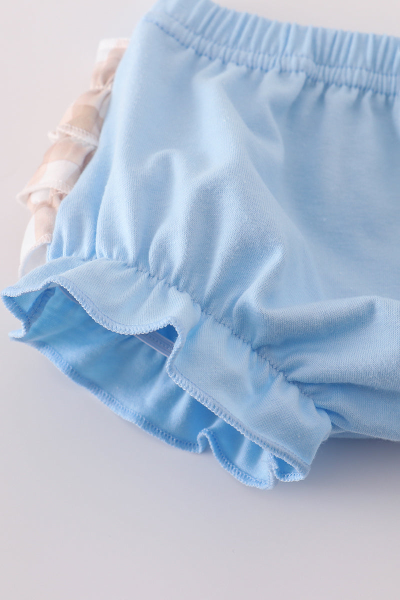 This adorable beige gingham bloomer set features charming puppy embroidery, perfect for your little one’s playful days. Soft and comfortable, it’s designed to keep your baby cozy while adding a cute, whimsical touch to their outfit. Ideal for sunny adventures or cozy indoor fun!