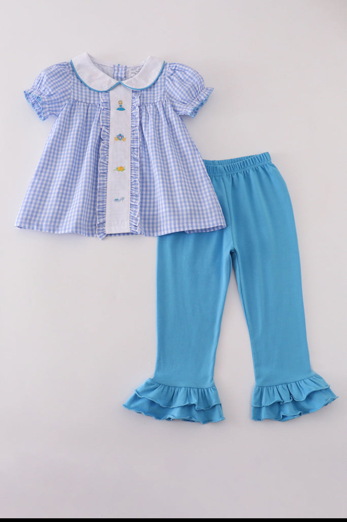 Your little princess will feel like royalty in this enchanting pant set, fit for fairy-tale adventures and storybook strolls. The top features a charming blue-and-white gingham pattern, beautifully accented with a classic Peter Pan collar and dainty blue piping. Down the front, a crisp white panel is trimmed with playful ruffles and showcases sweet embroidery of a princess crown, carriage, dainty shoes, and a castle-worthy gown—each stitch telling a tale of wonder and whimsy. The coordinating solid blue pants complete the look with ruffled hems that add just the right twirl-ready flair. Perfect for tea parties, magical outings, or everyday royal moments 👑✨