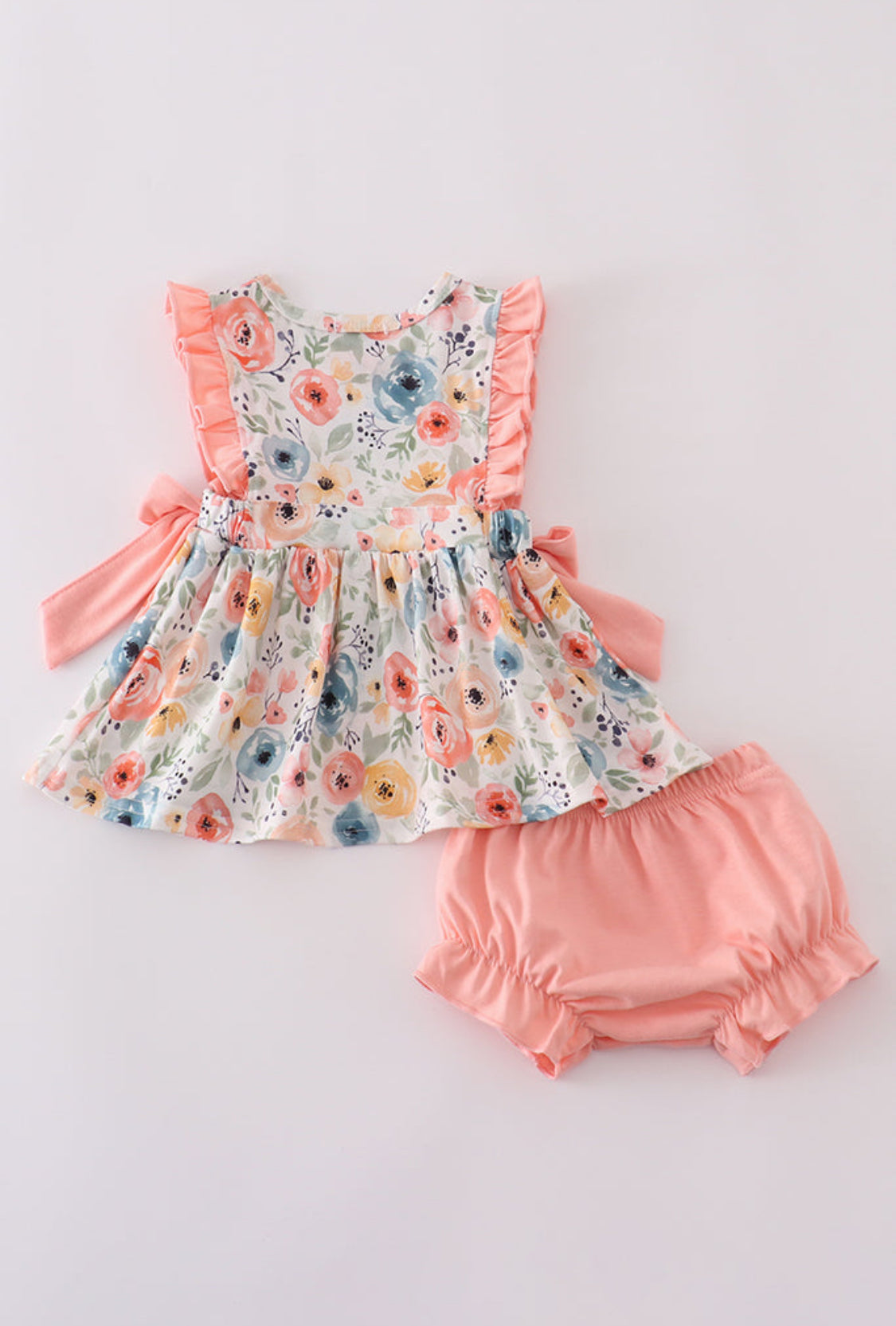 Paired with solid pink bloomers, featuring a comfy elastic waistband and leg openings, this outfit is designed for carefree summer adventures.