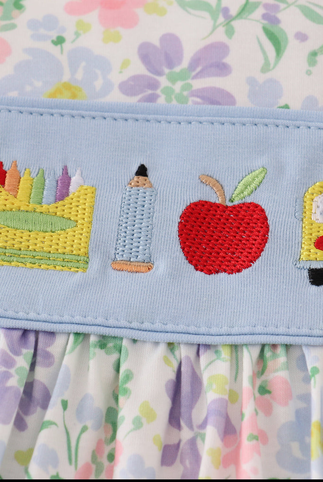 But the real magic is in the embroidered blue chest panelโa delightful showcase of school-time fun! Featuring a colorful stack of books, a pencil, a shiny apple, a school bus, and a creative paint palette, this detail turns the dress into a celebration of learning and curiosity. Whether she's heading to class, picture day, or just dreaming up her next big idea, this dress is ready for every moment! ๐โจ