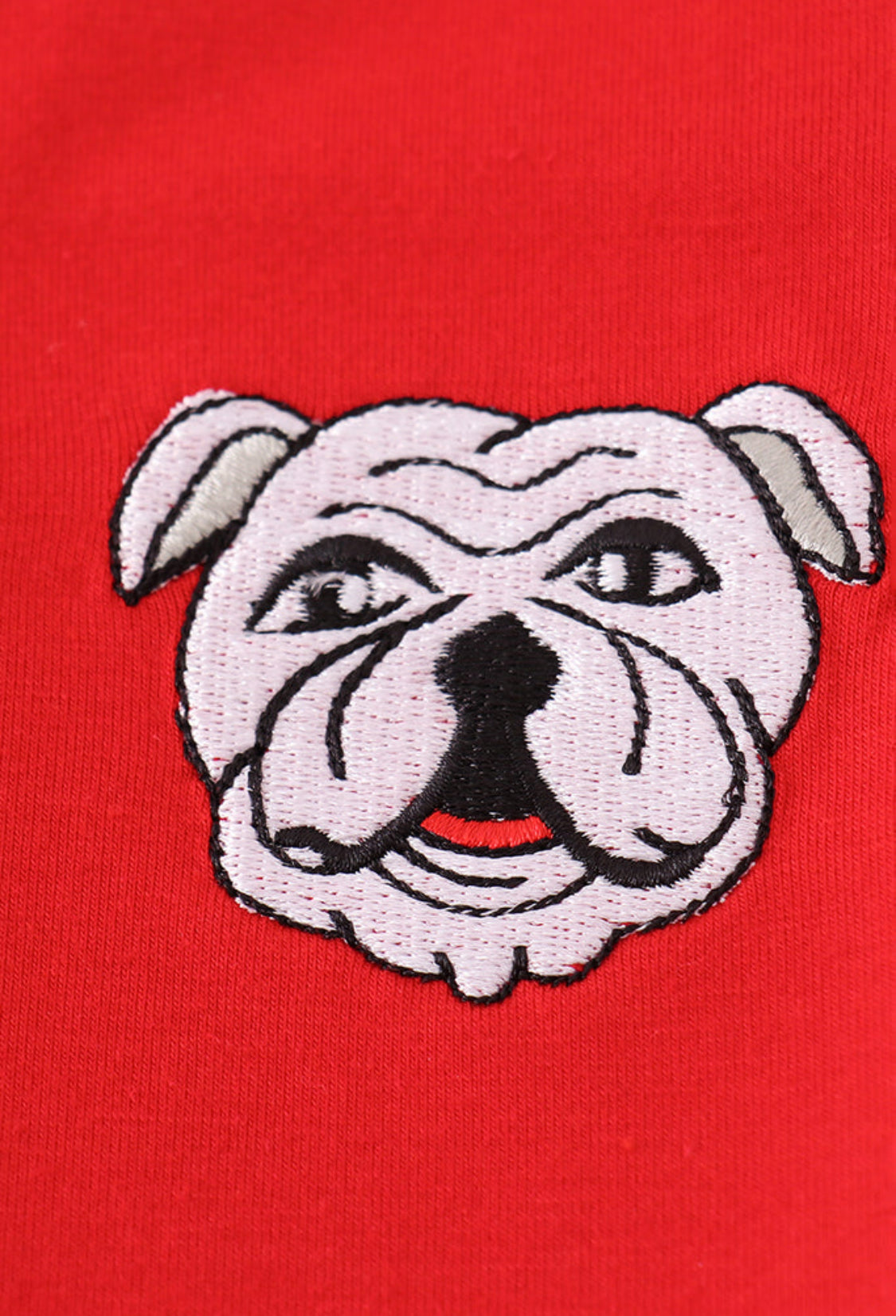 Featuring vibrant, detailed stitching of the iconic bulldog mascot, it adds a fun and spirited touch to your casual wardrobe. Perfect for game days or everyday wear, this top combines comfort with a bold statement of loyalty.