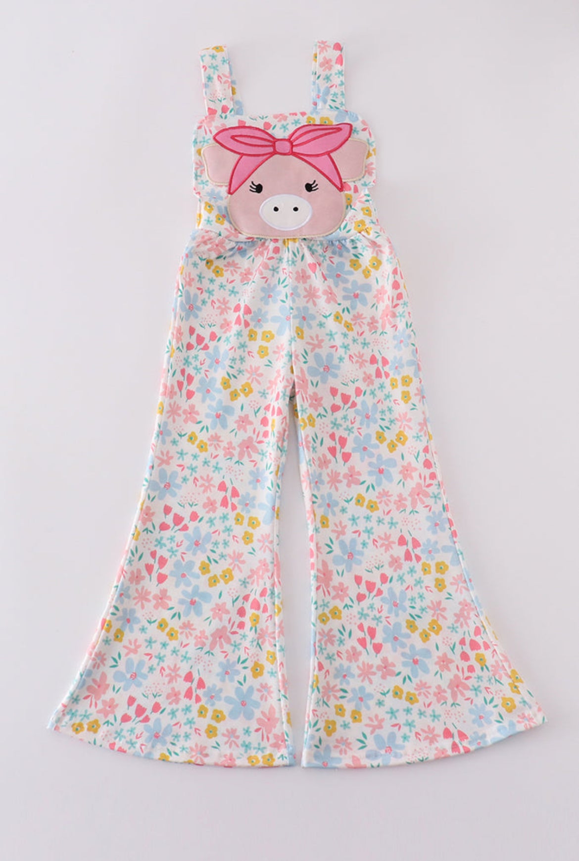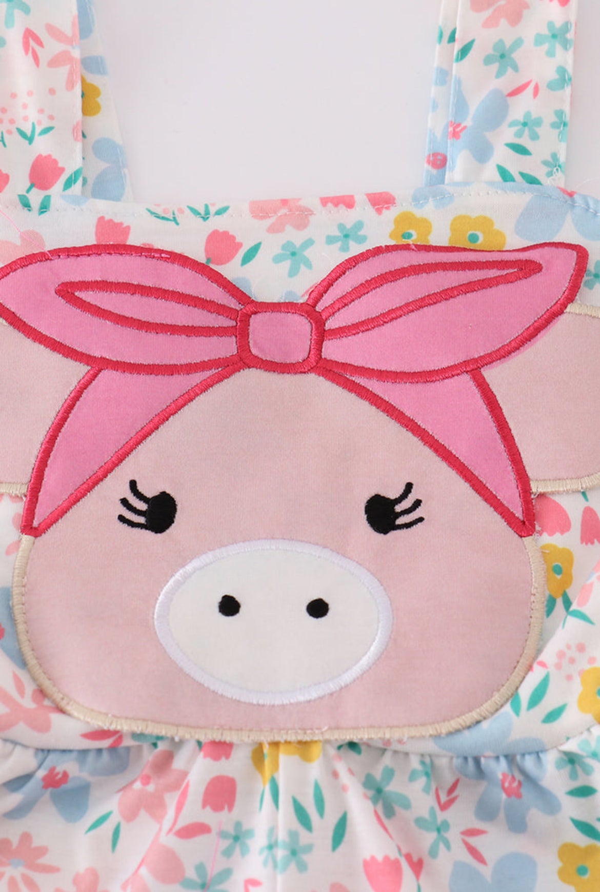 The highlight of the jumpsuit is the adorable applique of a pig's face on the bodice. The pig has sweet, closed eyes with long eyelashes and a snout, and it wears a delightful pink bow on its head, adding a whimsical and fun touch to the design.