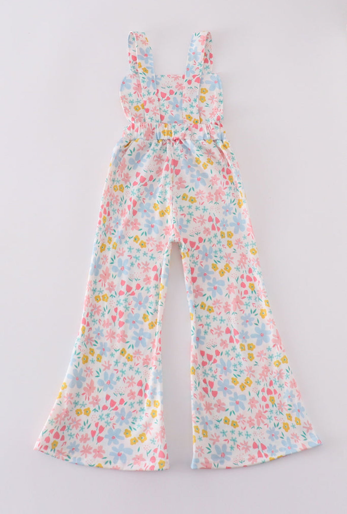 This girl's jumpsuit is a cheerful and lively outfit, perfect for brightening up any occasion. It features wide-legged pants and shoulder straps, ensuring a comfortable fit with a playful silhouette. The fabric is adorned with a vibrant floral pattern, showcasing blooms in shades of pink, blue, yellow, and green—a celebration of color and charm.