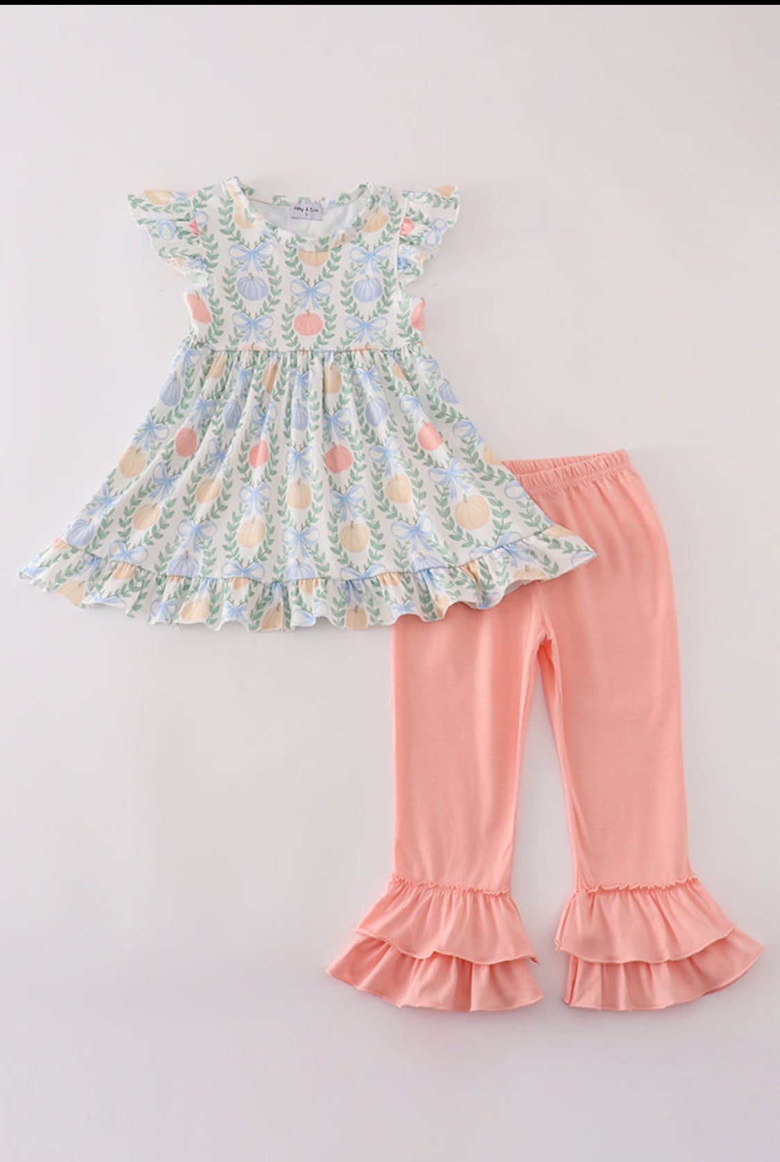 This darling pant set is a celebration of sweet summertime joy, perfect for garden strolls, sunny picnics, or twirling through a daydream. The sleeveless top steals the show with its fluttery ruffle sleeves and playful A-line silhouette, blooming in a watercolor-inspired floral print of bluebells, peach blossoms, and buttery yellow petals on a creamy background. Coordinating solid peach pants bring comfort and whimsy, finished with ruffled hems that echo the top’s charming flair.