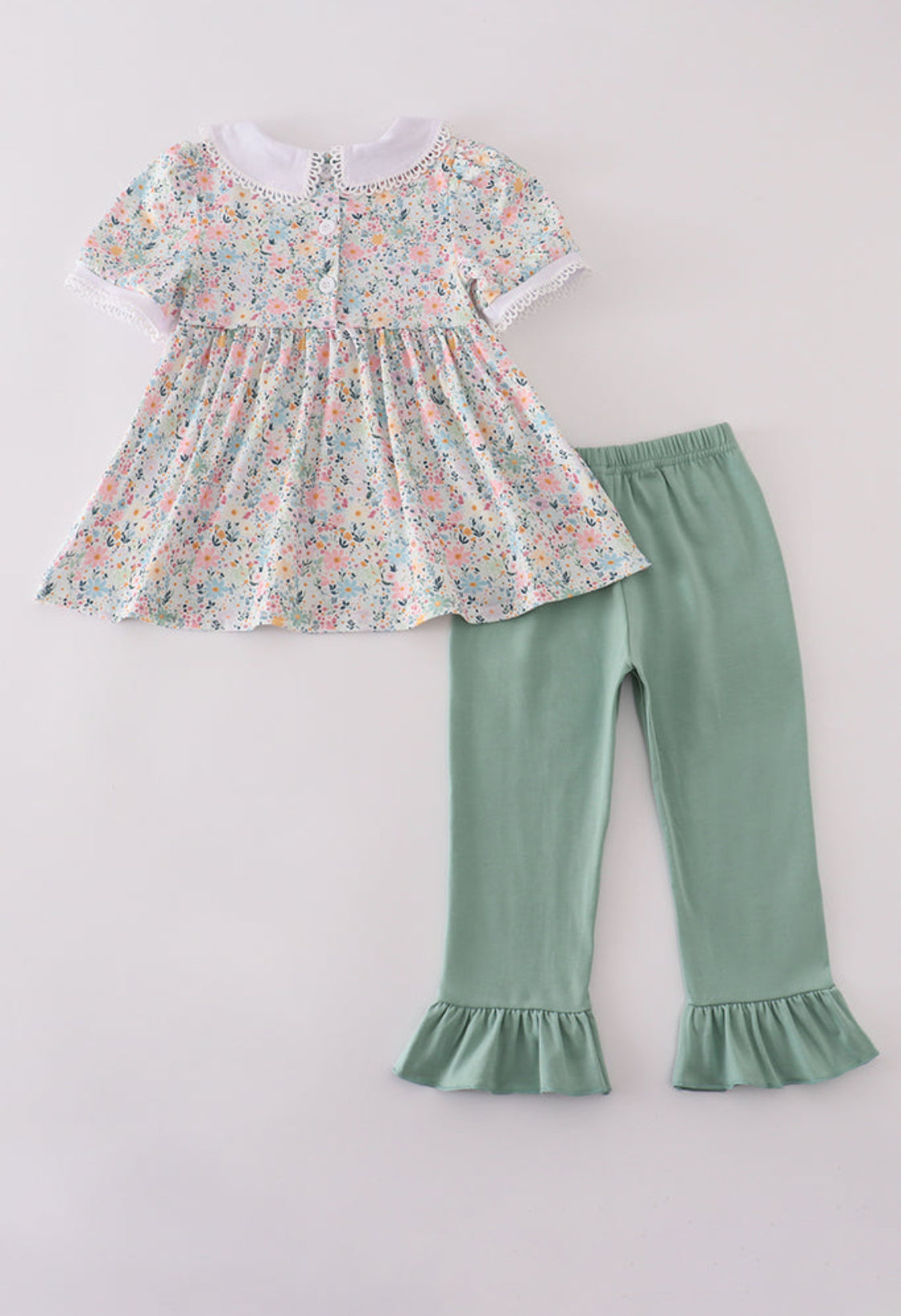 Green Floral Pumpkin Embroidery Smocked Ruffle Girl’s Pants Set
