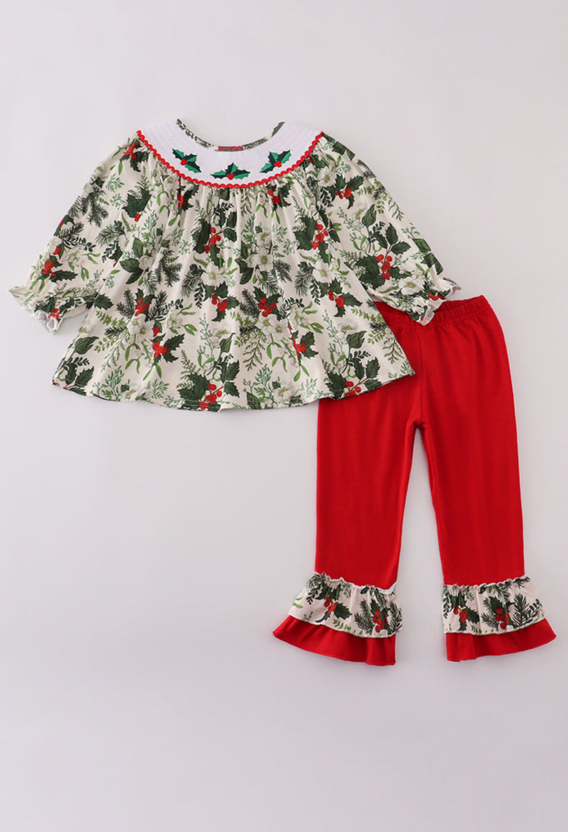 Green Holly Floral Smocked Ruffle Girl’s Pants Set