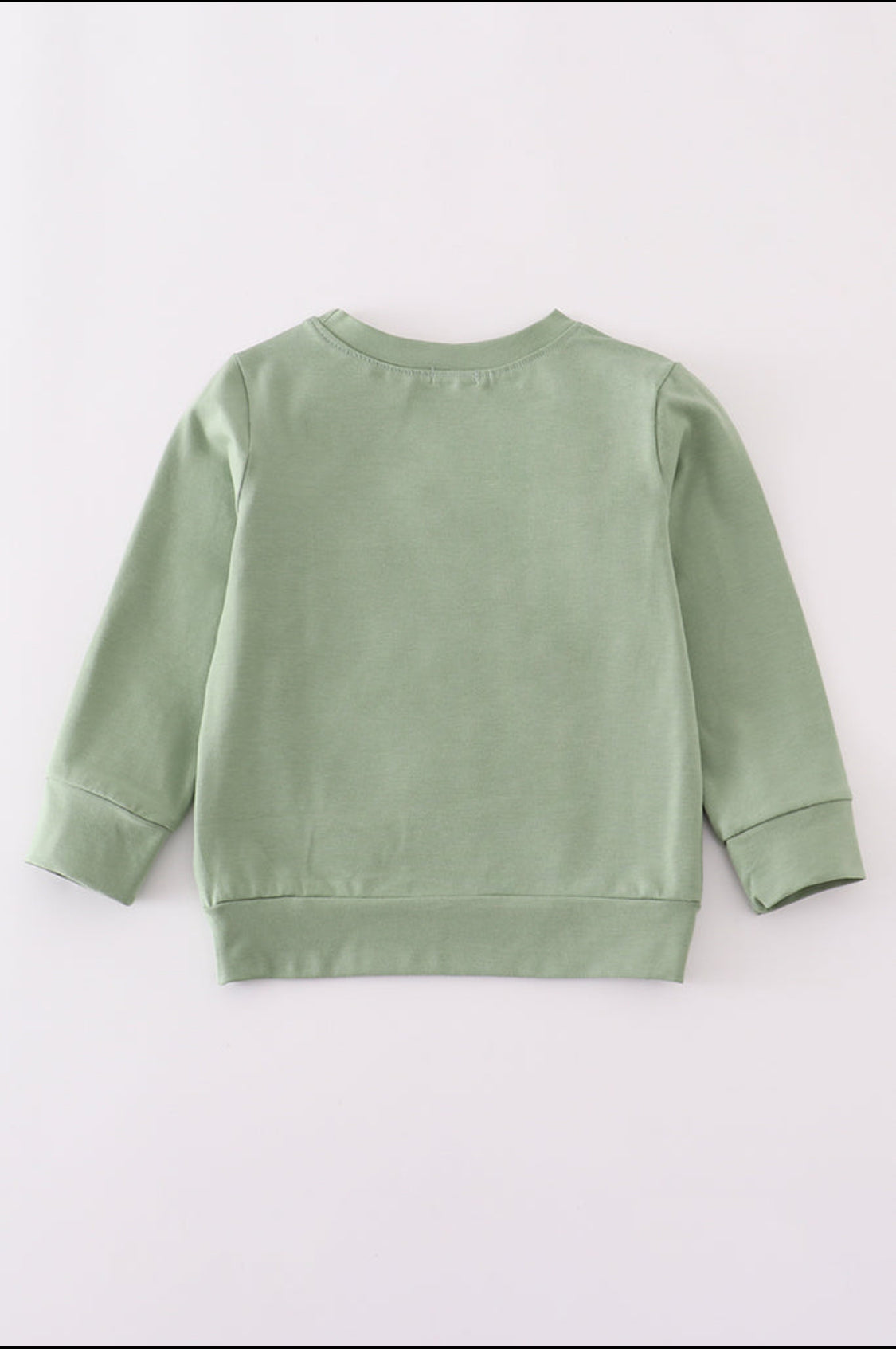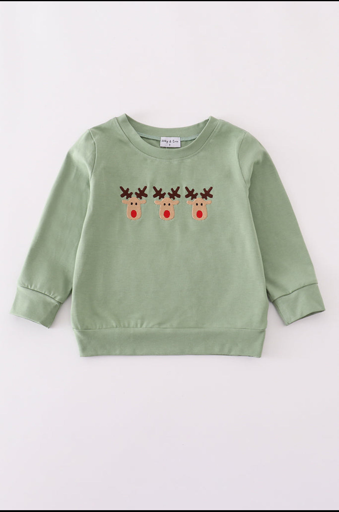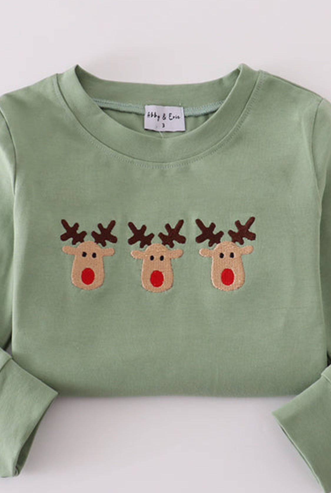 Celebrate festive fun in this playful green top featuring charming reindeer embroidery. Its vibrant color and whimsical design add a joyful touch to your casual wardrobe, perfect for spreading holiday cheer all season long. Comfortable and eye-catching, it's a delightful choice to brighten any day with a bit of festive spirit.My