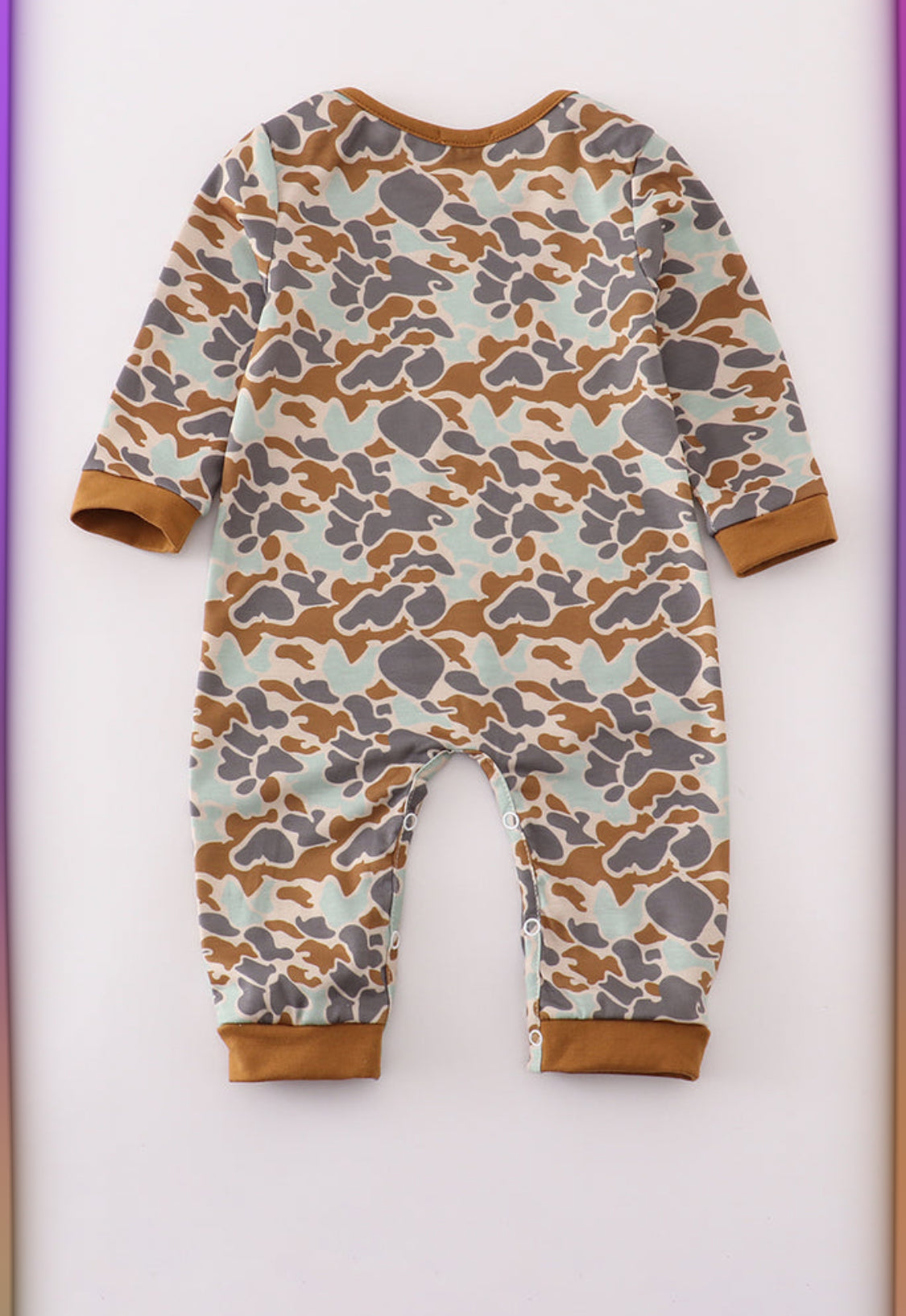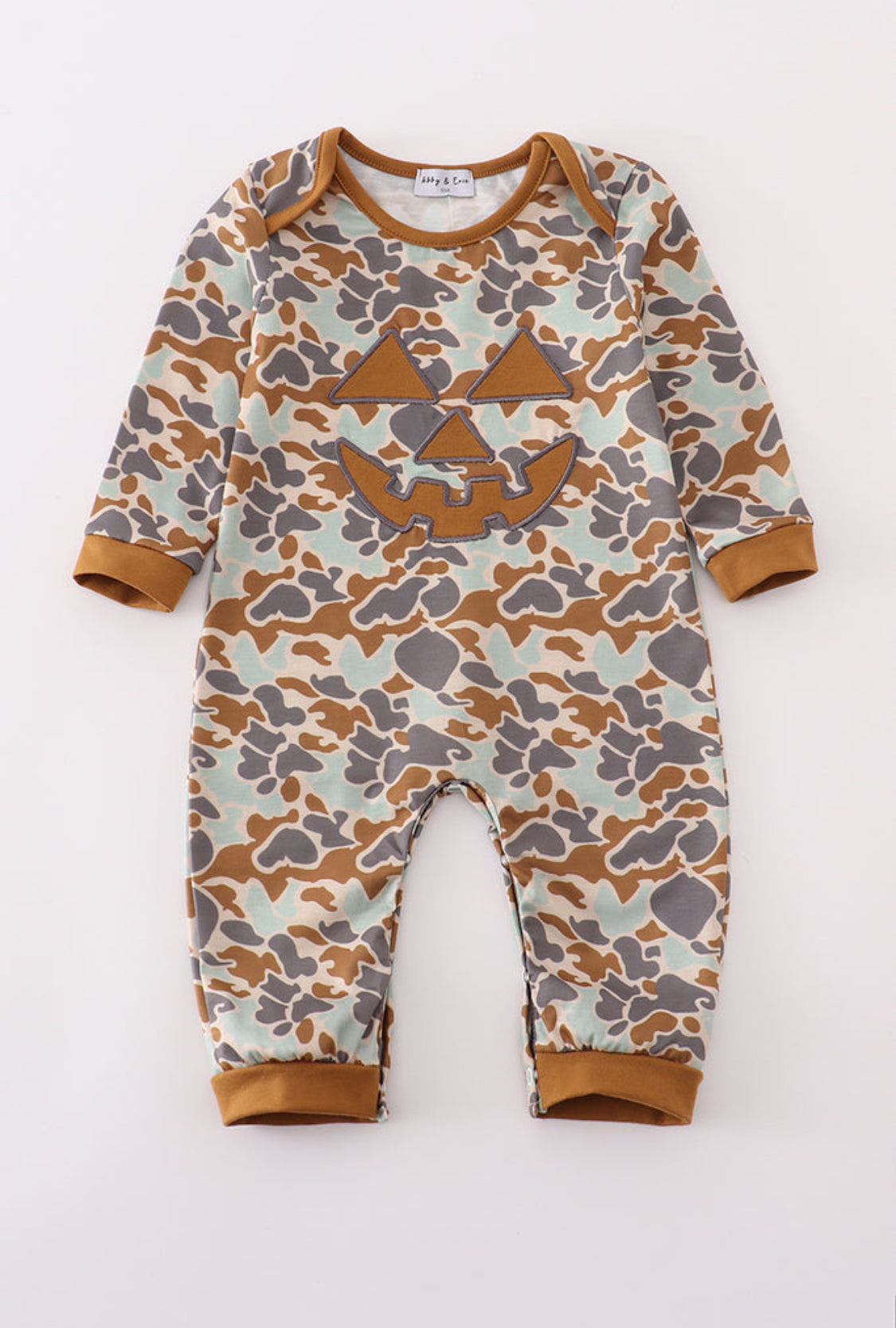 Get ready to spook in style with this Halloween camouflage applique romper! Featuring a fun blend of festive motifs and subtle camo patterns, it's perfect for little ghouls and goblins who want to stand out while blending in.