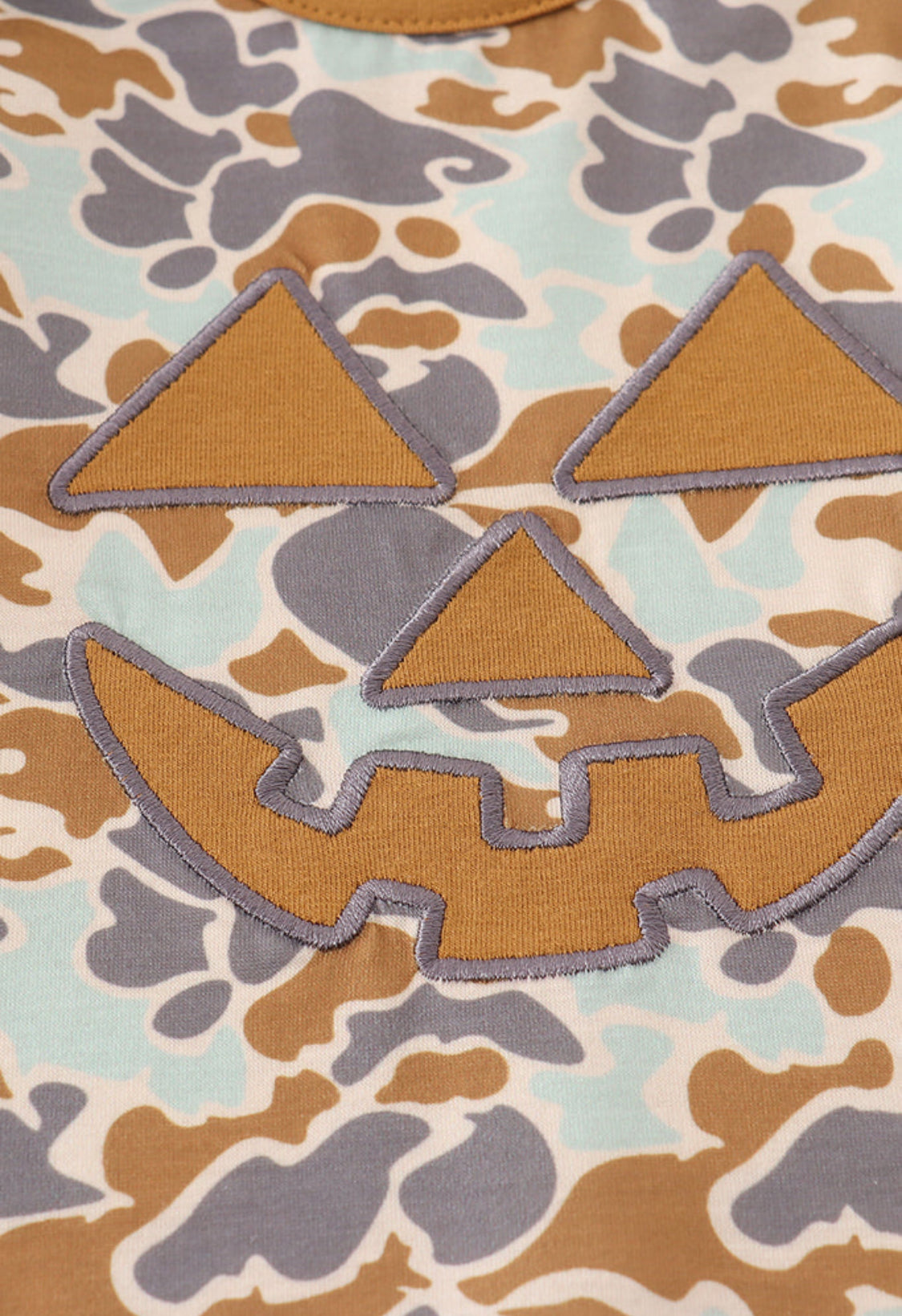 Celebrate Halloween in style with this playful camouflage applique ruffle dress. Featuring fun Halloween-themed appliques and charming ruffles, it adds a festive twist to classic camo. Perfect for parties or trick-or-treating, this dress combines comfort with spirited flair to make your little one stand out in the crowd.