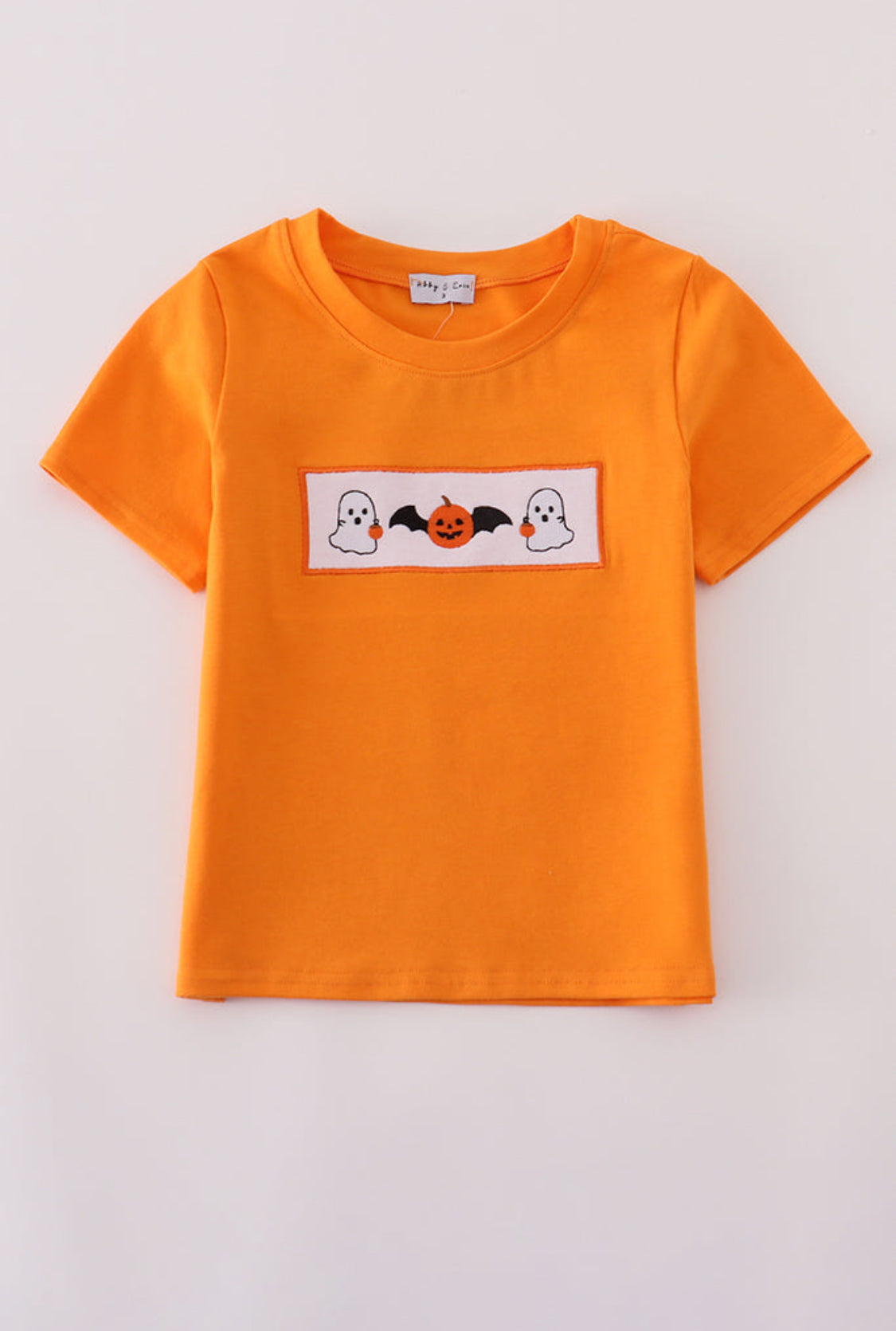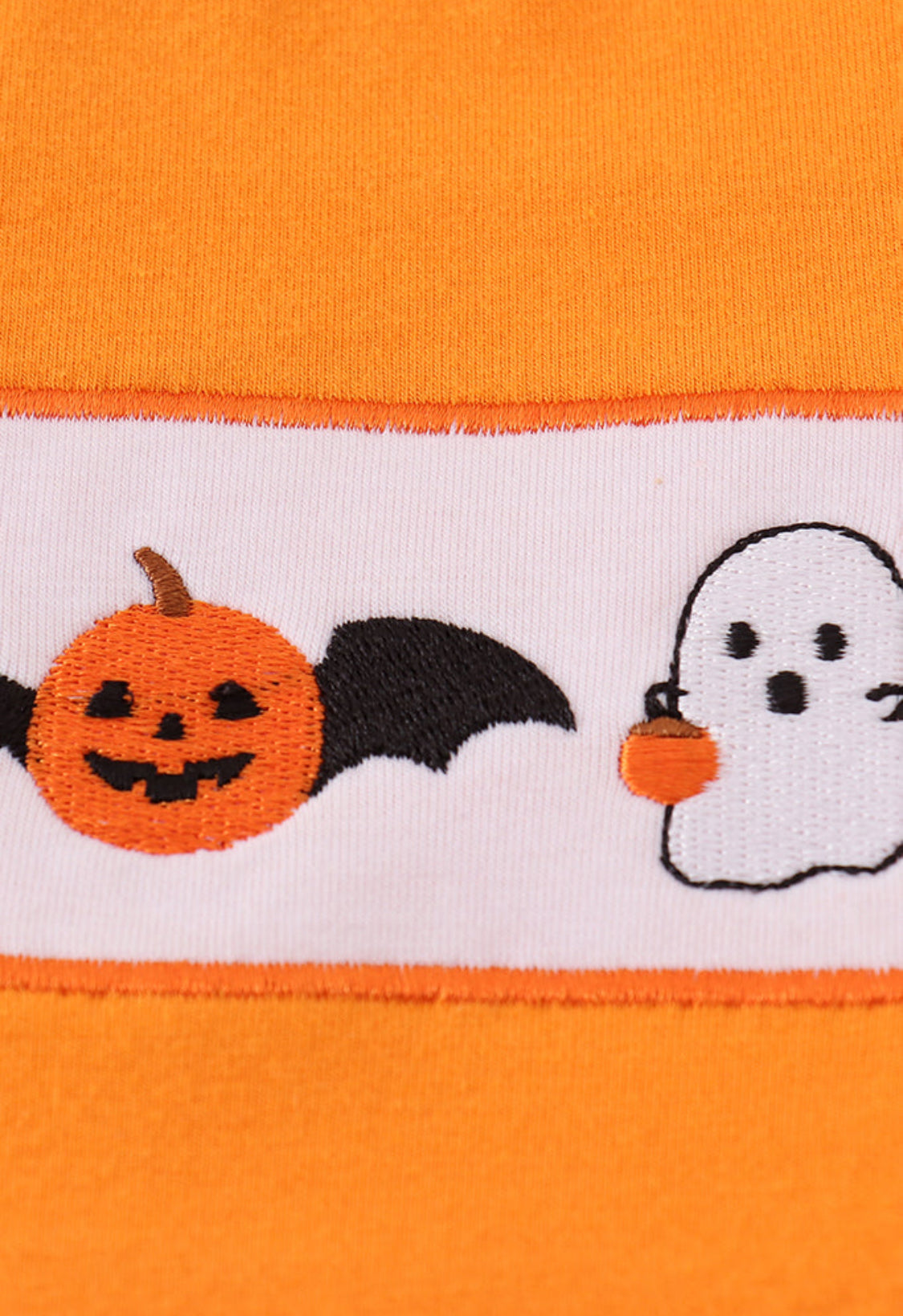 Celebrate the spooky season in style with this playful orange top featuring charming Halloween pumpkin and ghost embroidery. Perfect for adding a festive touch to your wardrobe, its vibrant design brings fun and whimsy to any casual outfit. Cozy and cute, it's a delightful way to show your Halloween spirit!