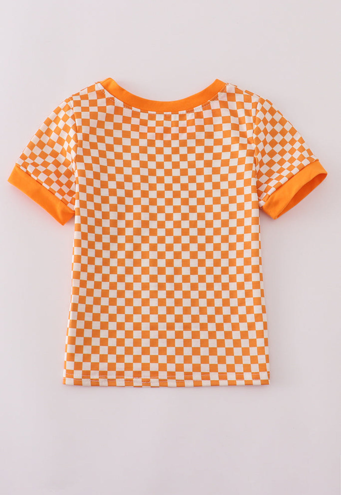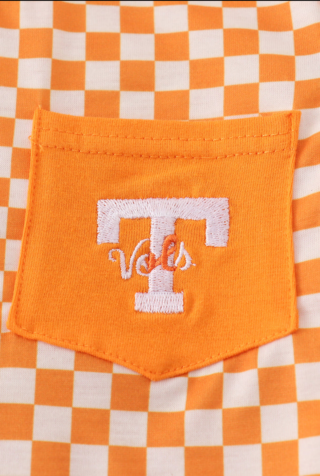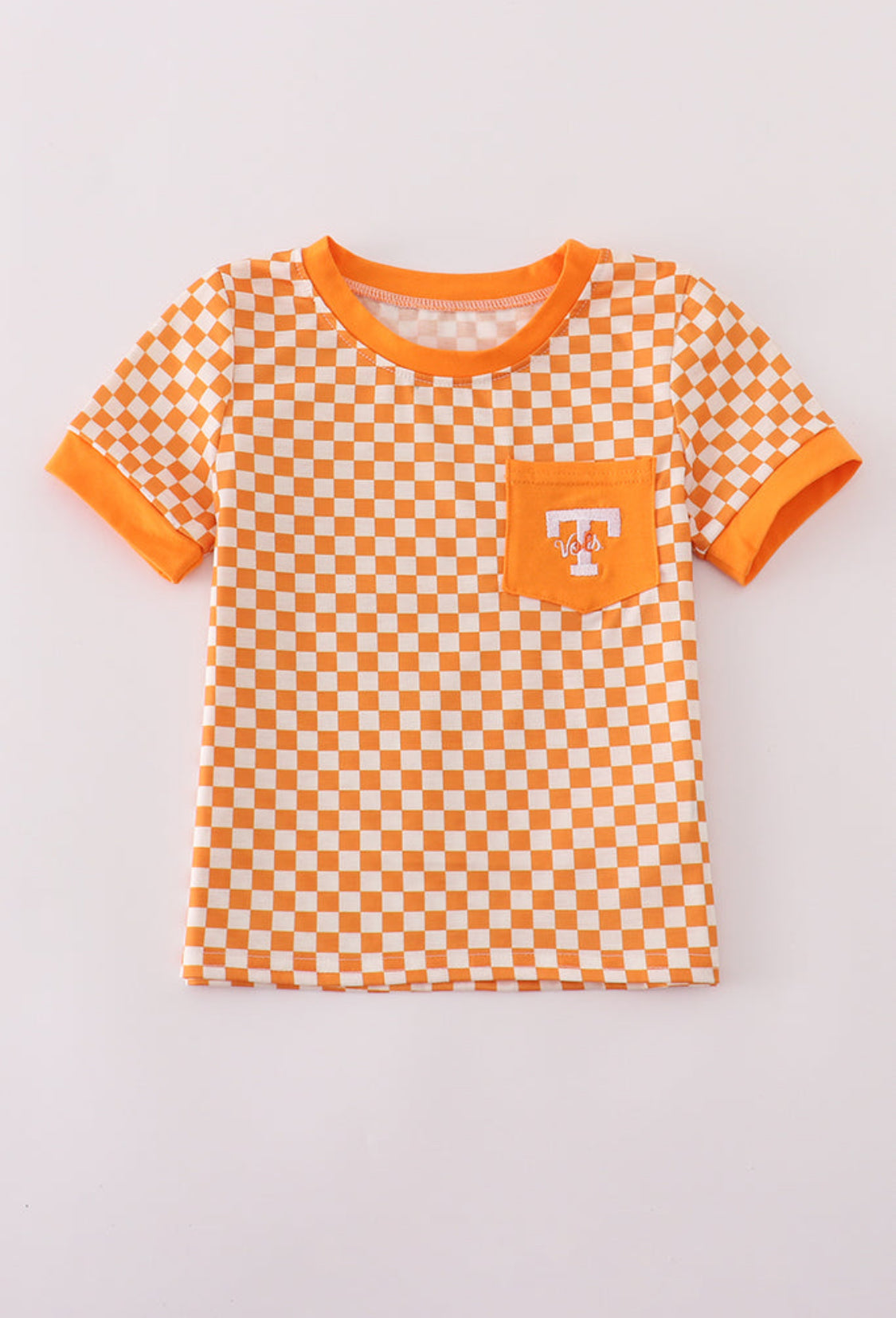 Show your team spirit with this playful Orange Tennessee Go Vols embroidery checkered top. Featuring vibrant orange hues and a fun checkered pattern, it's perfect for game day or casual outings. The detailed