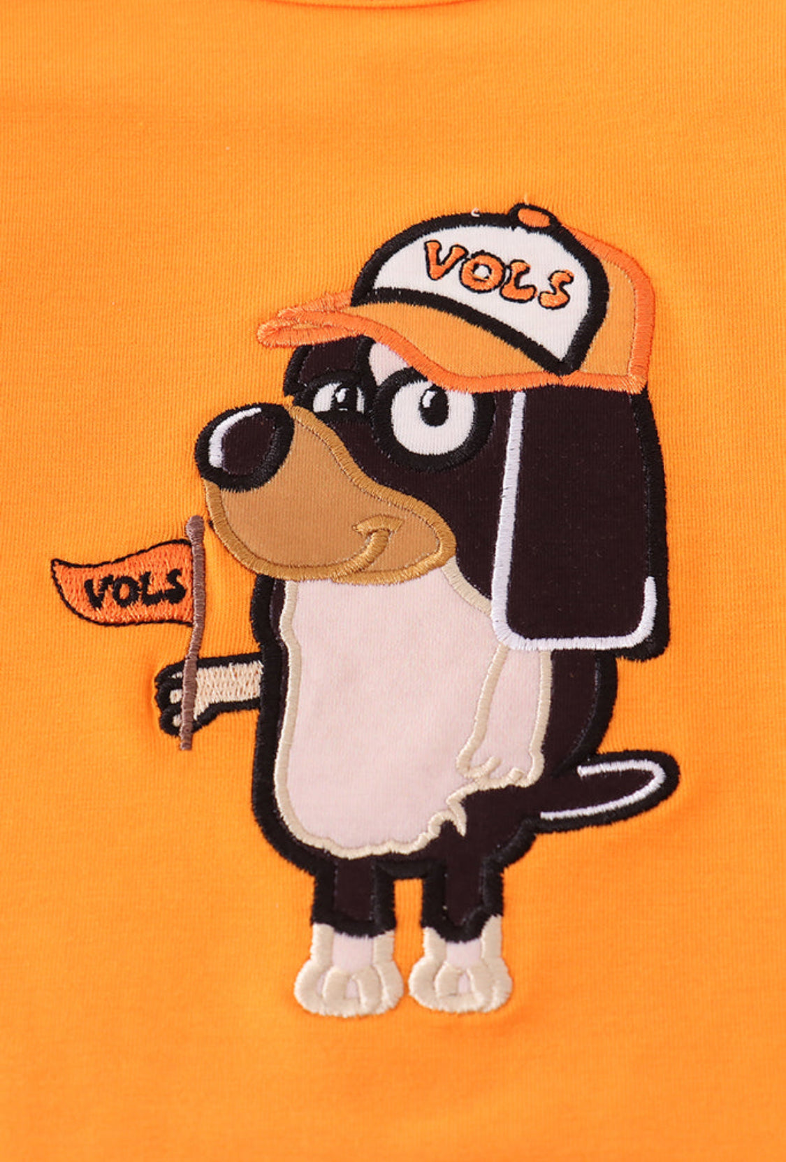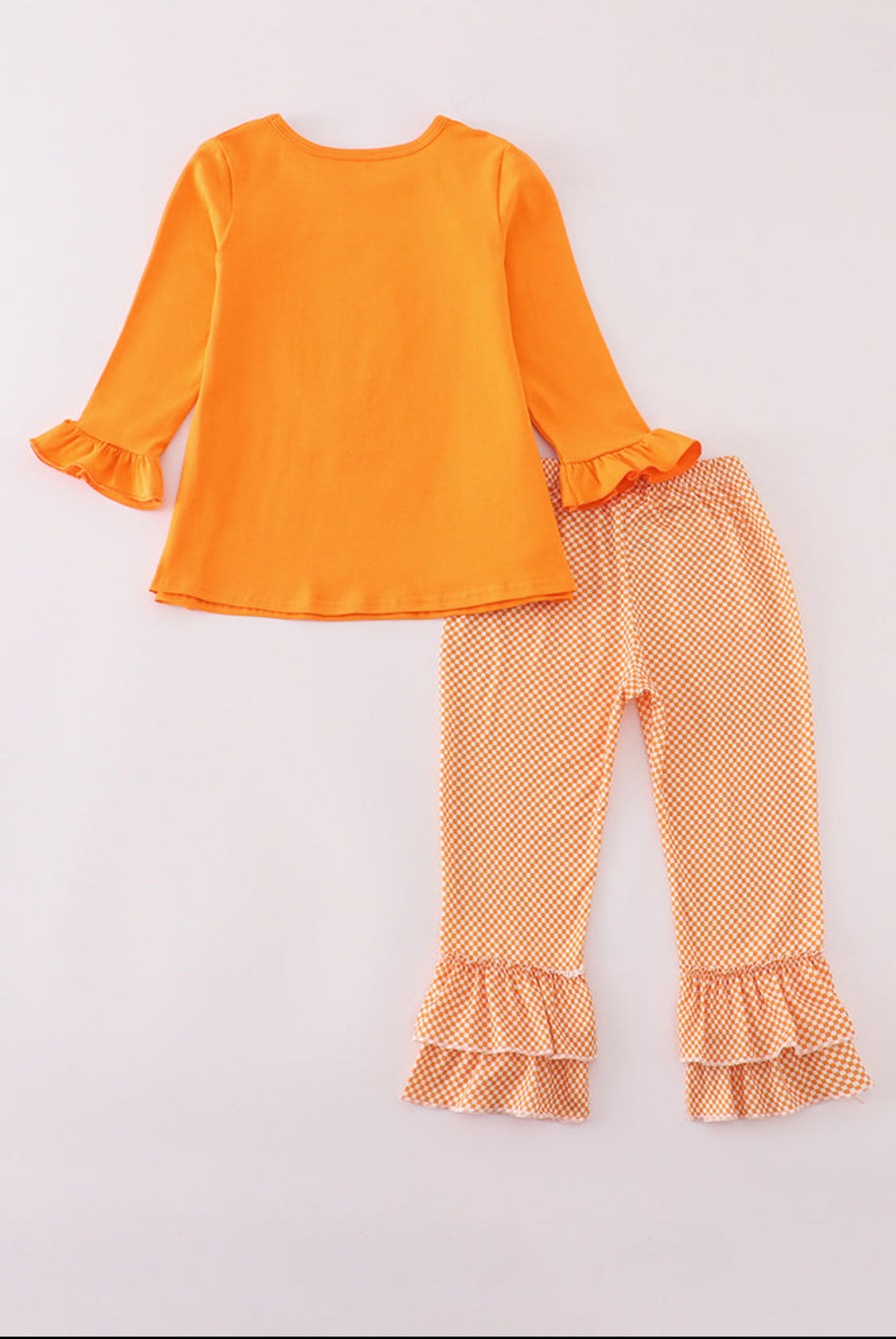 Show your team spirit in style with this playful Orange Tennessee Go Vols applique ruffle pants set. Featuring vibrant orange hues and charming applique details, the ruffled pants add a fun, flirty touch perfect for game day or casual outings. Comfortable and eye-catching, this set lets you cheer on your Vols with flair and ease.