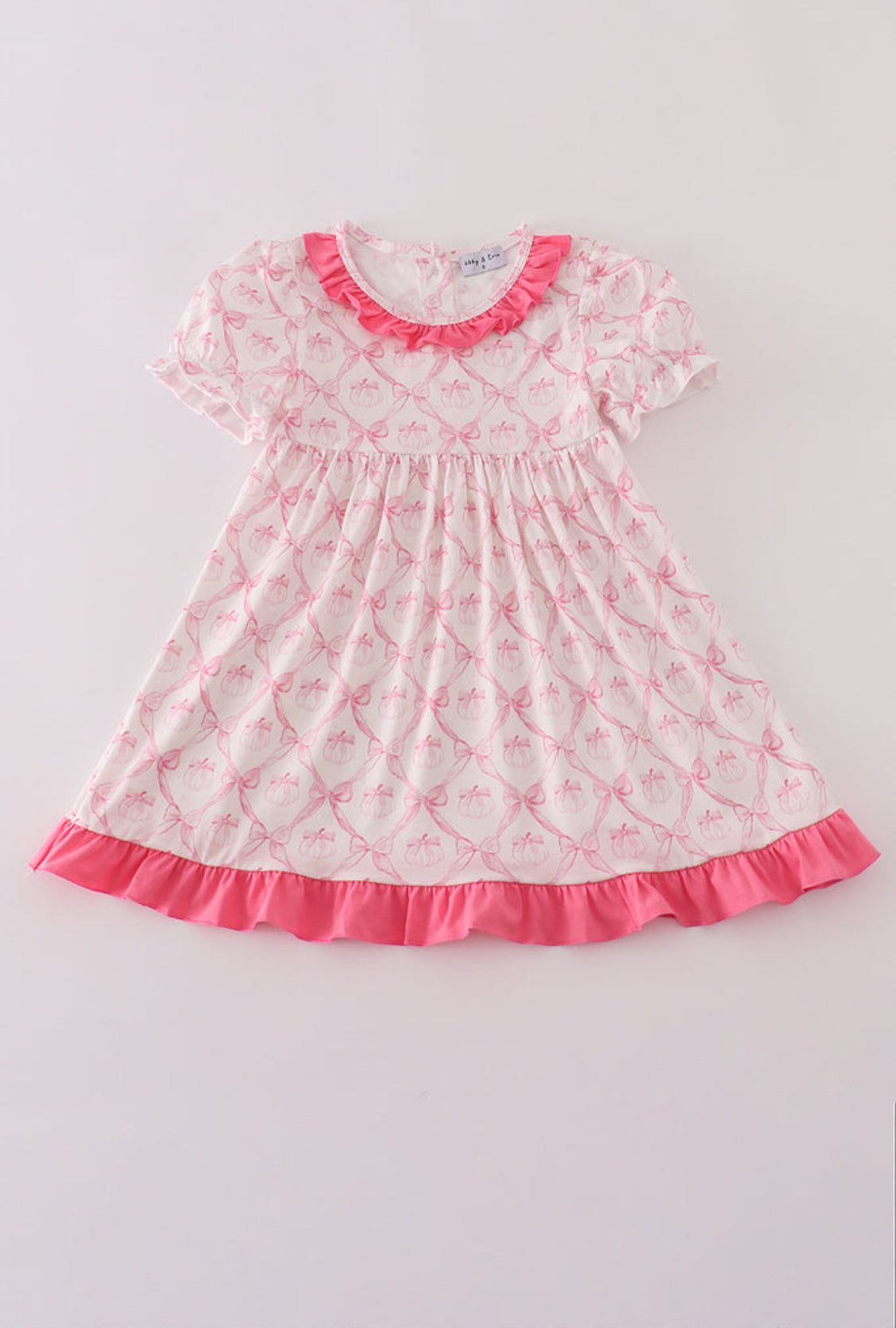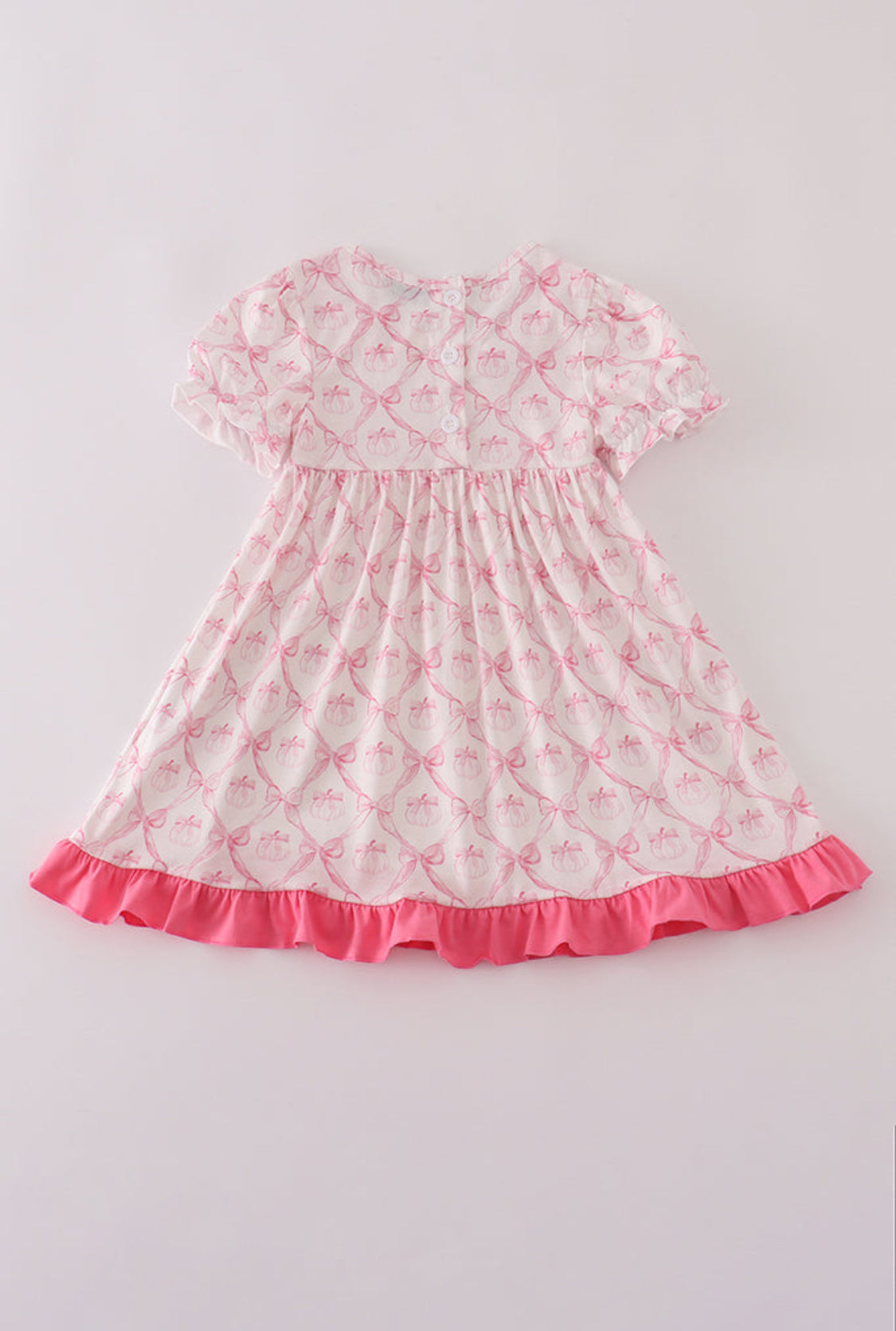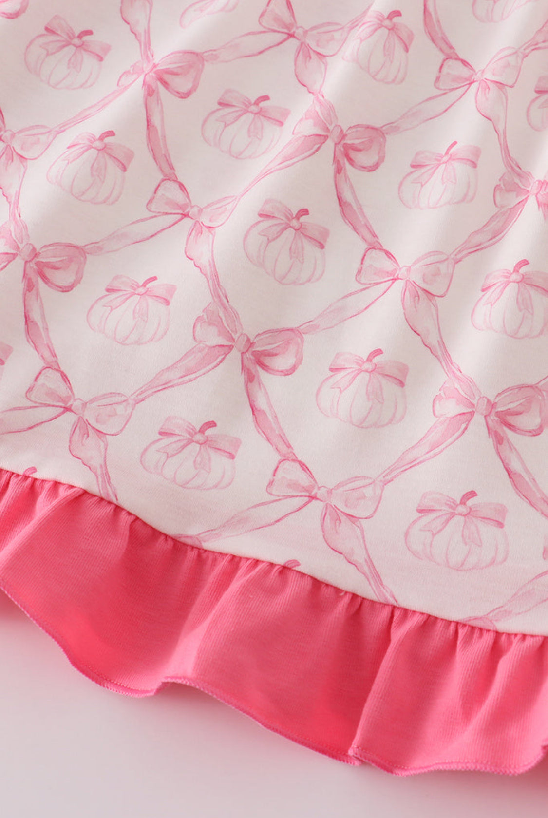 This playful pink dress features a charming pumpkin print and a cute bow tie detail, perfect for adding a touch of festive fun to any occasion. Its vibrant design and comfortable fit make it an ideal choice for celebrating the season in style.