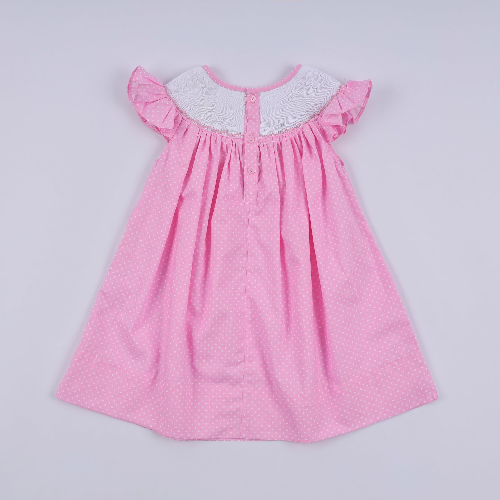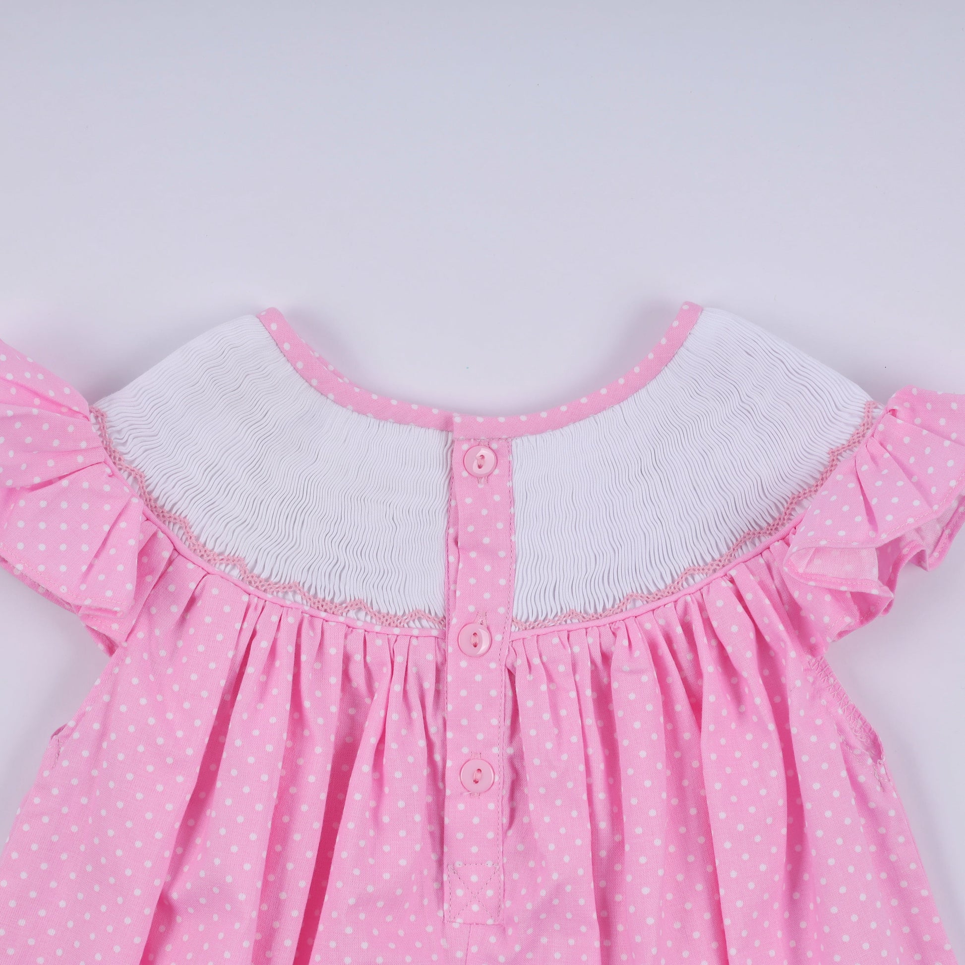 Twirl into adorable style with this charming pink dress! Featuring delicate hand-smocked detailing and sweet polka dots, it's perfect for little ones who love to play and pose. The ruffled hem adds extra flair and movement, making every moment feel special. Soft, comfortable, and oh-so-cute—this dress is ready for playdates, parties, or just being fabulous all day long!