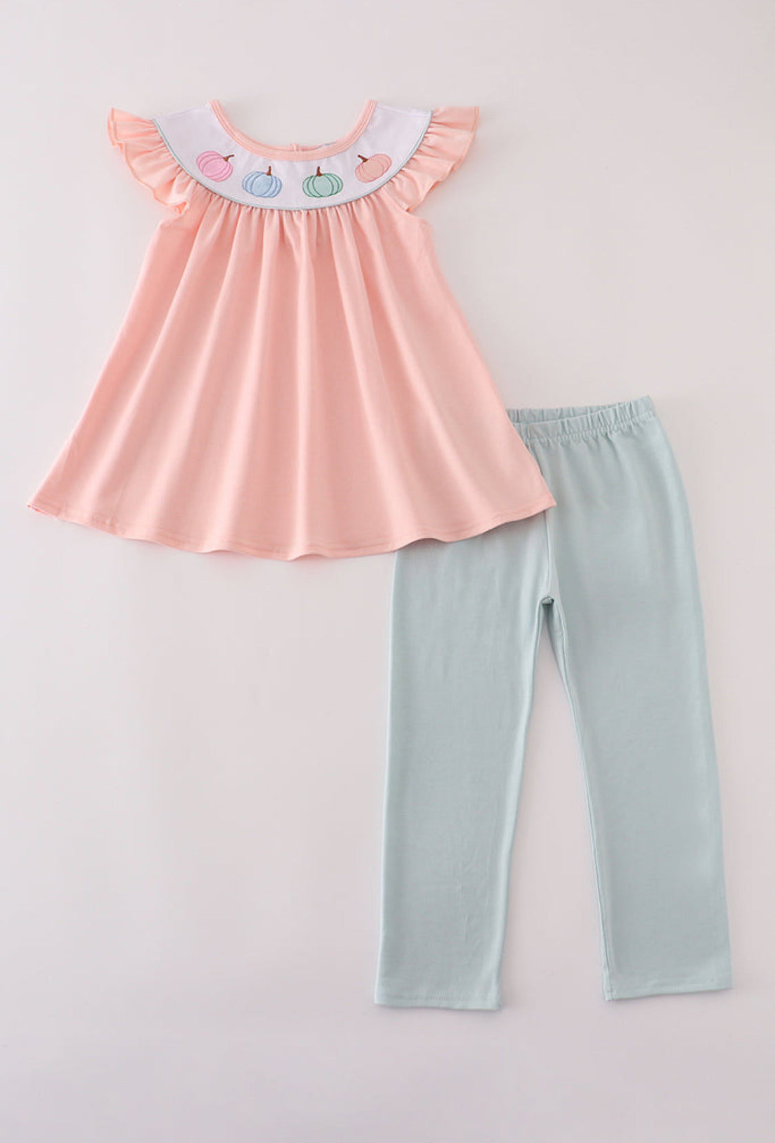 Bursting with boutique-worthy sweetness, this two-piece set captures the magic of early fall with a playful pastel twist. The peach-toned top features fluttery ruffle sleeves and a crisp white yoke embroidered with an enchanting row of pumpkins in soft hues—think blush pink, baby blue, mint green, and a hint of sunny orange. It’s a whimsical nod to harvest season, perfect for hayrides, school days, or cozy weekend outings. Paired with sky-blue leggings featuring an easy pull-on waistband, this outfit blends comfort with seasonal charm. Whether she’s chasing leaves or cuddled up for story time, this ensemble is ready for autumn adventures! 🍂🎃💕