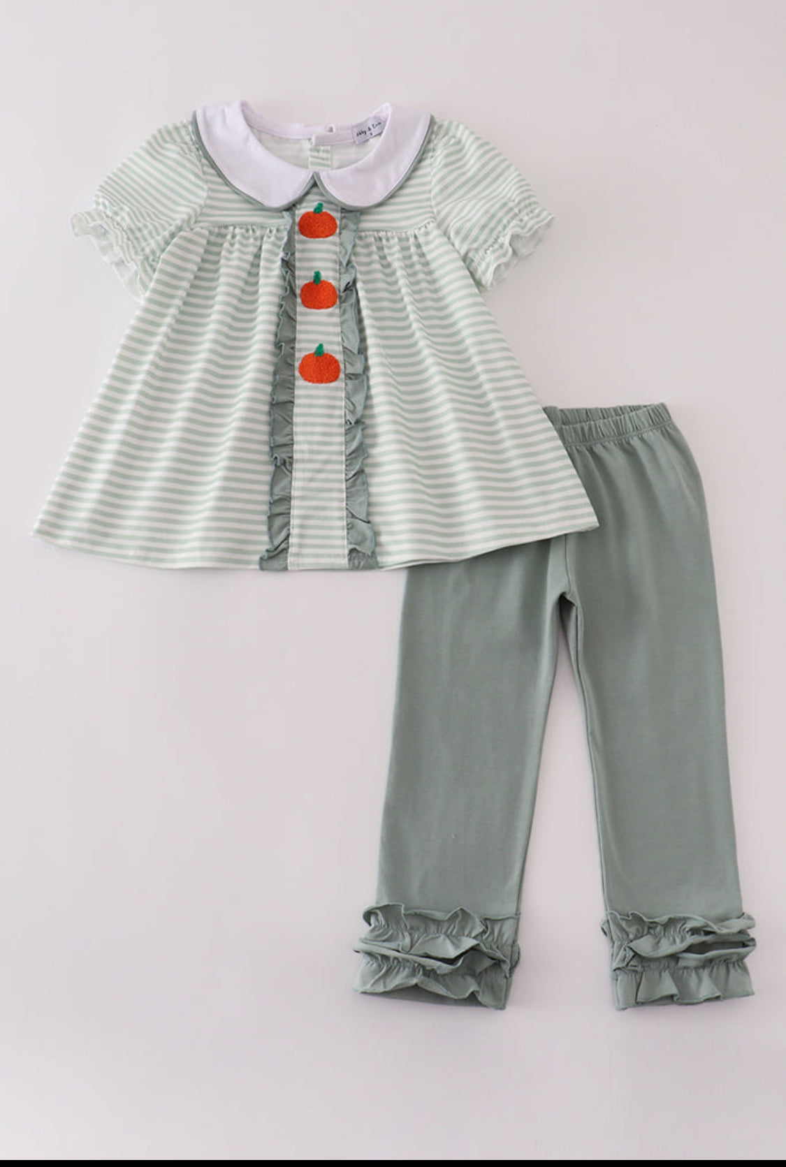 This precious pants set is ready to kick off the season with a burst of autumnal charm! The short-sleeve top features soft green and white stripes, accented with a crisp white Peter Pan collar for a touch of timeless sweetness. Marching down the front are three cheerful pumpkin appliqués—complete with playful green stems—bringing harvest magic to every wear. Ruffle trim along the button placket adds an extra layer of boutique flair.