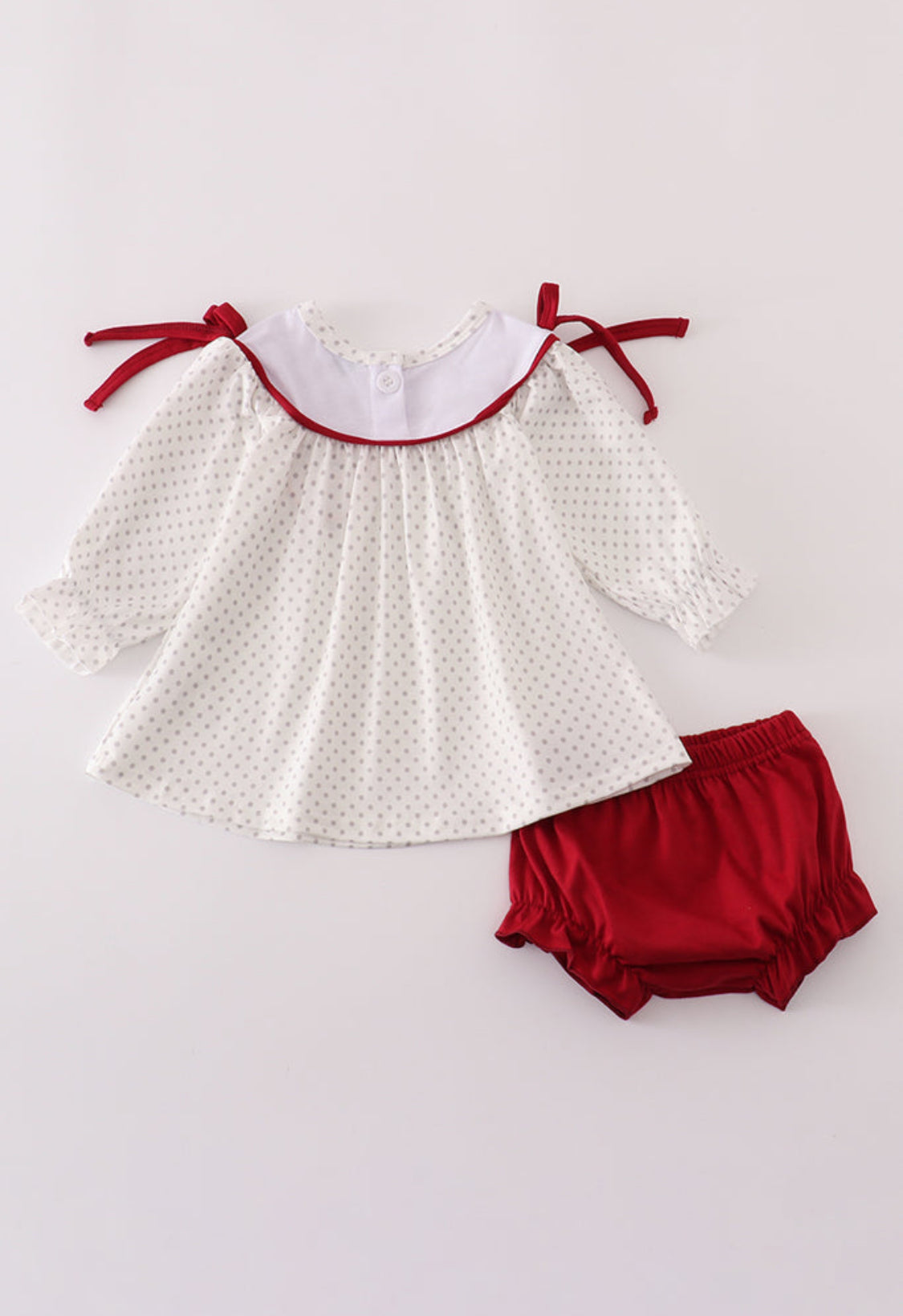 Dress your little one in charm with this Maroon Alabama embroidery dot bloomer set. Featuring playful embroidered details and a soft dotted pattern, it's perfect for sunny days and fun adventures. Comfortable and cute, this set adds a touch of spirited style to any outfit.