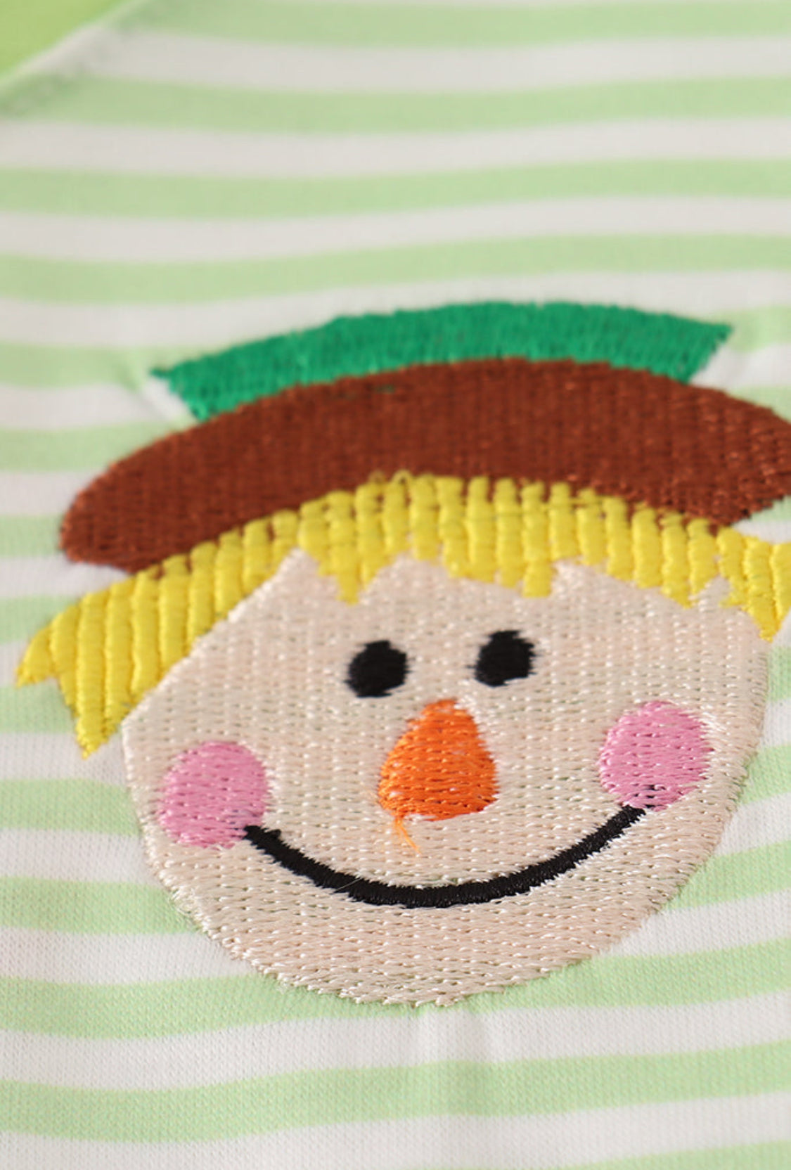 Add a touch of whimsy to your wardrobe with this green scarecrow embroidery stripe top. Featuring charming embroidered scarecrow details and playful stripes, it's perfect for brightening up any casual outfit.
